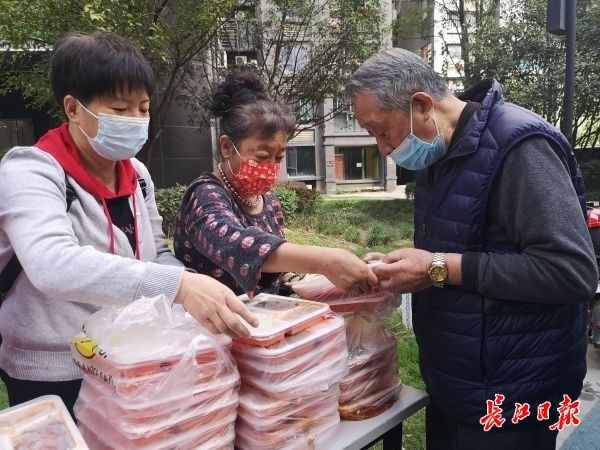 如果居民不便去“共享餐厅”,还可以享受送餐服务。20日中午11时,31份套餐准时送到小区物业门口,居民们拿着餐票有序排队领取。社区安排每周一集中售票,两荤一素的套餐每日有三种不同搭配,菜品在网格群里公布,供居民预订。